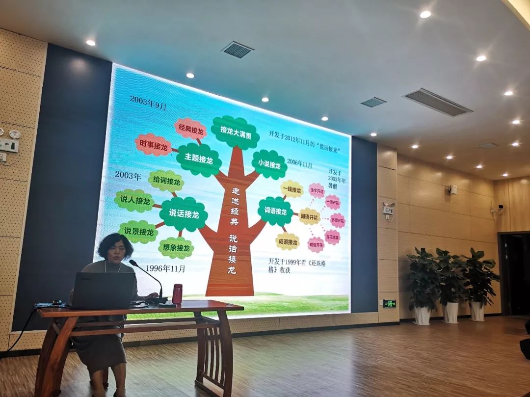 課堂結(jié)束后,丁老師又在階梯教室進(jìn)行了《說話接龍之積累、激活、應(yīng)用》的講座,和老師們分享了“生字開花 ”“說話接龍”教學(xué)的意義和具體實(shí)施方法。