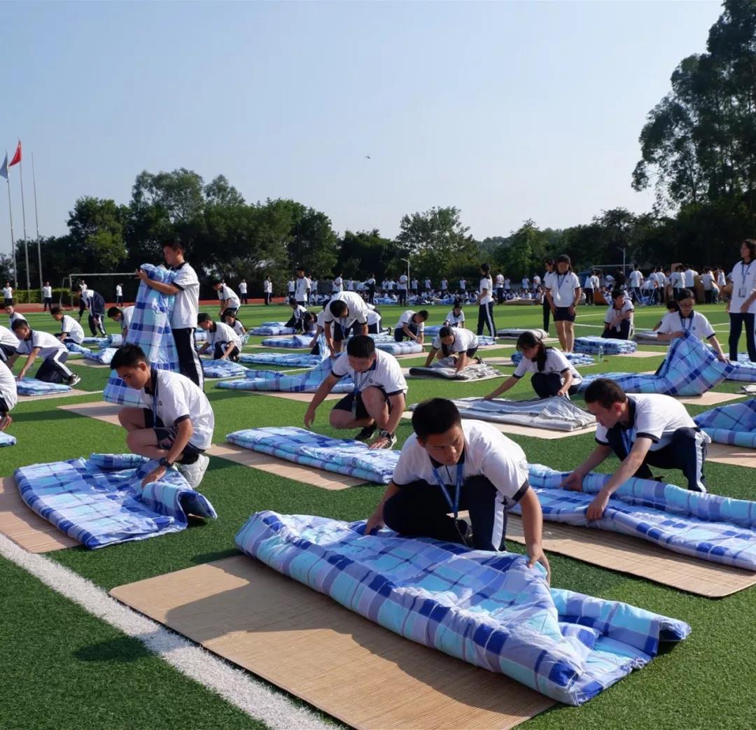 活動開場,全體師生奏唱校歌,很快激烈的疊被子比賽開始了。比賽實行分組對抗淘汰制,三局定勝負。