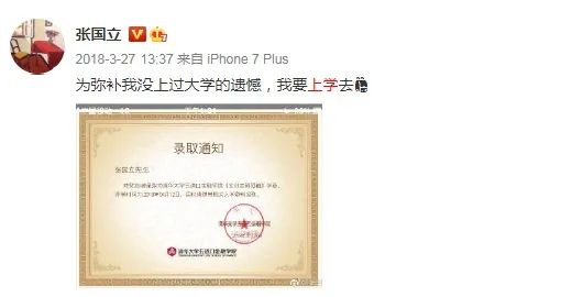 前年,64歲的演員張國立憑借自己的努力,自學考生,成功考上清華大學五道口金融學院,在收到錄取通知書后,第一時間在微博上分享了自己的喜悅,并配文“為彌補我沒上過大學的遺憾,我要上學去”。